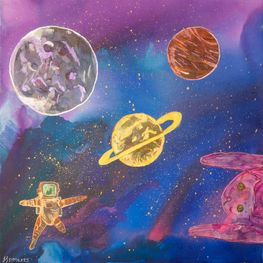 In the vast galaxy, a split second sees two friends separated. The astronaut and the pink cat reach for each other in desperation. Will they meet again soon?