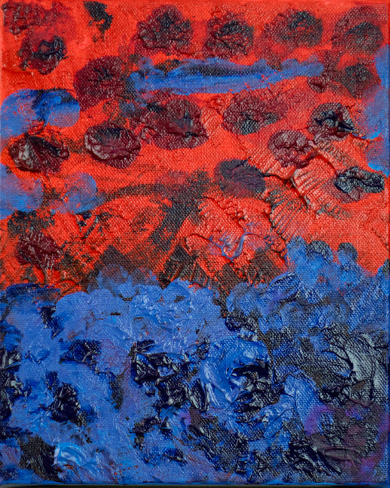 An exploration of acrylic medium on canvas, creating the effect of water and red flowers. Painted in the lead up to the 2025 election, with the thought of minor shifts in perspective. Red Vs blue could be more cooperative than in direct conflict