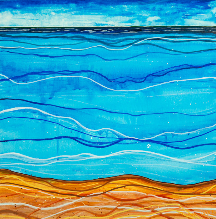 Before I go in the water, I like to sit on the beach and look at the waves, to work out the best spot to catch one. Unfortunately, due to physical limits, I haven’t been able to physically go into the surf, but I have been able to go there in my mind whilst painting this.