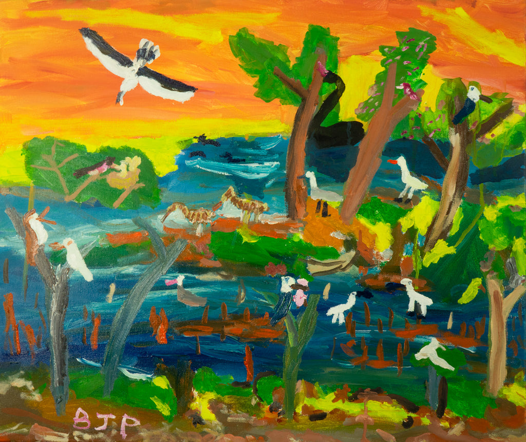 The birds start singing with the sunrise. The White Belly Sea Eagle is flying in the golden, morning sky. Kookaburras are laughing in the trees. Collard kingfish are looking for a seafood breaky. A Heron is wading in the low tide with migratory shore birds to the edge of the mangroves and a black swan in the deeper water.